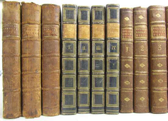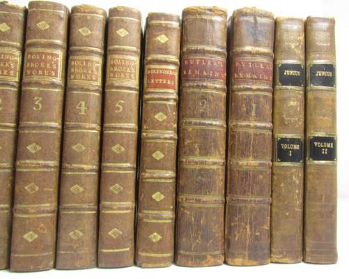 Characteristics of men manners, opinions, times. The sixth edition, corrected. [London], 1737. 3 volumes, 8vo, engraved portrait frontispiece in volume 1, engraved vignettes on the title-pages by Gribelin, contemporary panelled calf, spines worn, bookplates of Campbell of Shawfield; Chesterfield, Philip Dormer Stanhope Earl of Letters written to his son, together with several other pieces on various subjects. London: J. Dodsley, 1775. Sixth edition. 4 volumes, 8vo, portrait frontispiece to volume 1, 19th century half calf, marbled boards, upper margin of frontispiece with water stain, occasional few spots; Bolingbroke, Henry St. John, Viscount The philosophical works. London, 1754. 5 volumes, 8vo, contemporary sprinkled calf, a little wear to heads and tails, and a few scratches on boards; [Idem] Letters on the study and use of history. New edition corrected. London: for A. Millar, 1752. 8vo, contemporary sprinkled calf; Butler, Samuel The genuine remains in verse and prose. London: Tonson, 1759. First edition thus, 2 volumes, 8vo, contemporary sprinkled calf, rubbed; The Junius Stat nominis umbra. London: Bensley, 1805. 2 volumes, 8vo, engraved titlepage to each volume, engraved portraits as frontispeices in each volume, other engraved portraits, contemporary calf, lettering pieces renewed (17)