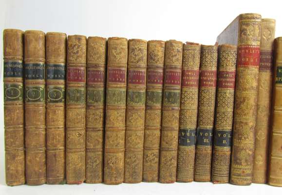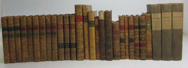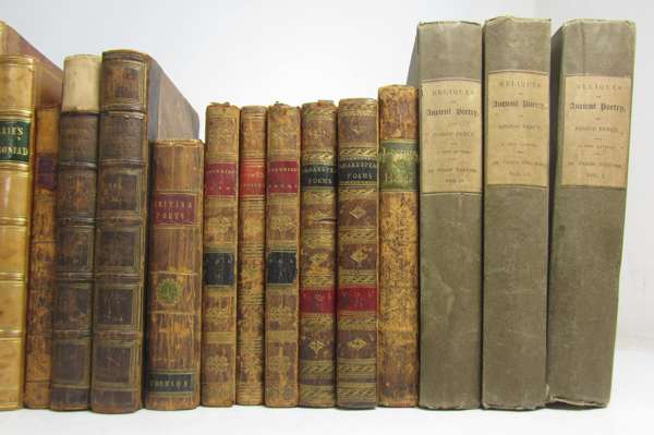 The works in verse and prose. London: for J. Dodsley, 1777. Mixed edition, volumes 1 and 2 fifth edition, volume 3 a new edition, 3 volumes, 8vo, engraved frontispieces and large engraved vignettes on the titles of volumes 1 and 2, other engraved vignettes and tailpieces, folding plan in volume 2, contemporary sprinkled calf, black and green morocco lettering pieces, spines and edges rubbed; A Collection of poems by several hands. London: Dodsley, 1775. 6 volumes, 8vo, engraved vignettes and plates contemporary calf, spines decorated gilt in compartments, red and green morocco lettering pieces, spines and edges rubbed, with the armorial bookplate of Oliphant of Rossie; Hall-Stevenson, John The works. London: Nicholas, 1795. 3 volumes, 8vo, engraved frontispieces to volumes 1 and 2, contemporary sprinkled calf, spines decorated gilt, red and black morocco lettering pieces, heads, tails and joints rubbed, endpapers renewed; [Wilkie, William] The Epigoniad: a poem in nine books. Edinburgh: Hamilton, Balfour, & Neill, 1757. First edition, 8vo, 19th century light tan calf; Stevens, George Alexander A lecture on heads ... to which is added an essay on satire. [bound with] Songs comic and satirical. London: Kearsley, 1788. 2 works in one volume, 12mo., fldg. engraved frontispiece to the first work, contemporary sheep; Rowley, Thomas, et al. Poems supposed to have been written at Bristol in the fifteenth century. Cambridge: by B. Flower, 1794. 8vo, engraved title-page, contemporary tree calf, spine decorated gilt in compartments, red morocco lettering piece; and 11 others