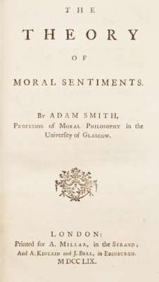 Note: Kress 5815; Goldsmiths' Library 9537; ESTC T141578. Extremely rare first edition of Smith's pioneering first book and the foundation of his monumental Wealth of Nations, both seminal works demonstrating "a great unifying principle… Smith's ethics and his economics are integrated by the same principle of self-command, or self-reliance, which manifests itself in economics in laissez faire" (Spiegel, Growth of economic thought, 229-231). The publication of Theory of Moral Sentiments "first carried his fame to the outside world." (PMM 221)