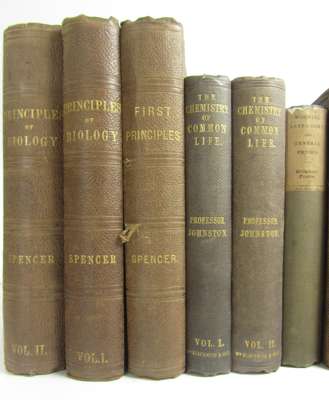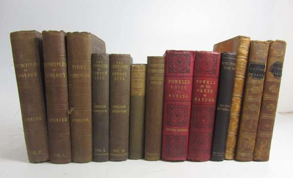 The principles of biology. London: Williams & Norgate, 1864-67. First edition, 2 volumes, 8vo, publisher's cloth, spines a little faded, joints weak, small book label of Dr John Young at the foot of first title-page; [Idem] First principles. London: Williams and Norgate, 1862. First edition, 8vo, publisher's cloth, small snag in spine; Johnston, James F.W. The chemistry of common life. Edinburgh: Blackwood, 1855. First edition, 2 volumes, 8vo, publisher's cloth, bindings spotted; Agassiz, L. Methods of study of natural history. Boston: Tricknor and Fields, 1864. First thus, 8vo, publisher's cloth, small library label of Dr John Young at foot of title-page; Butler, Joseph, Bishop The works. Edinburgh: Constable, 1804. 2 volumes, portrait frontispiece, contemporary calf, spines rubbed; Powell, Baden, The Revd. The unity of worlds and of nature. Three essays. Second edition revised and corrected. London: Longman et al., 1856. 8vo, publisher's cloth; [Idem] The connexion of natural and divine truth or, the study of inductive philosophy considered as subservient to theology. London: Parker, 1838. 8vo, contemporary half calf, cloth boards; and two others (13)
