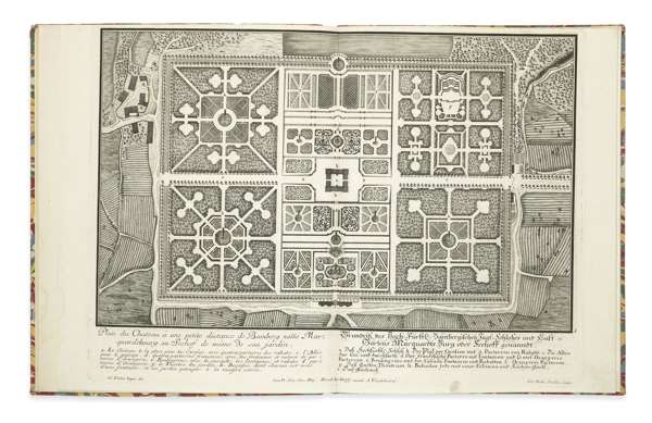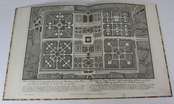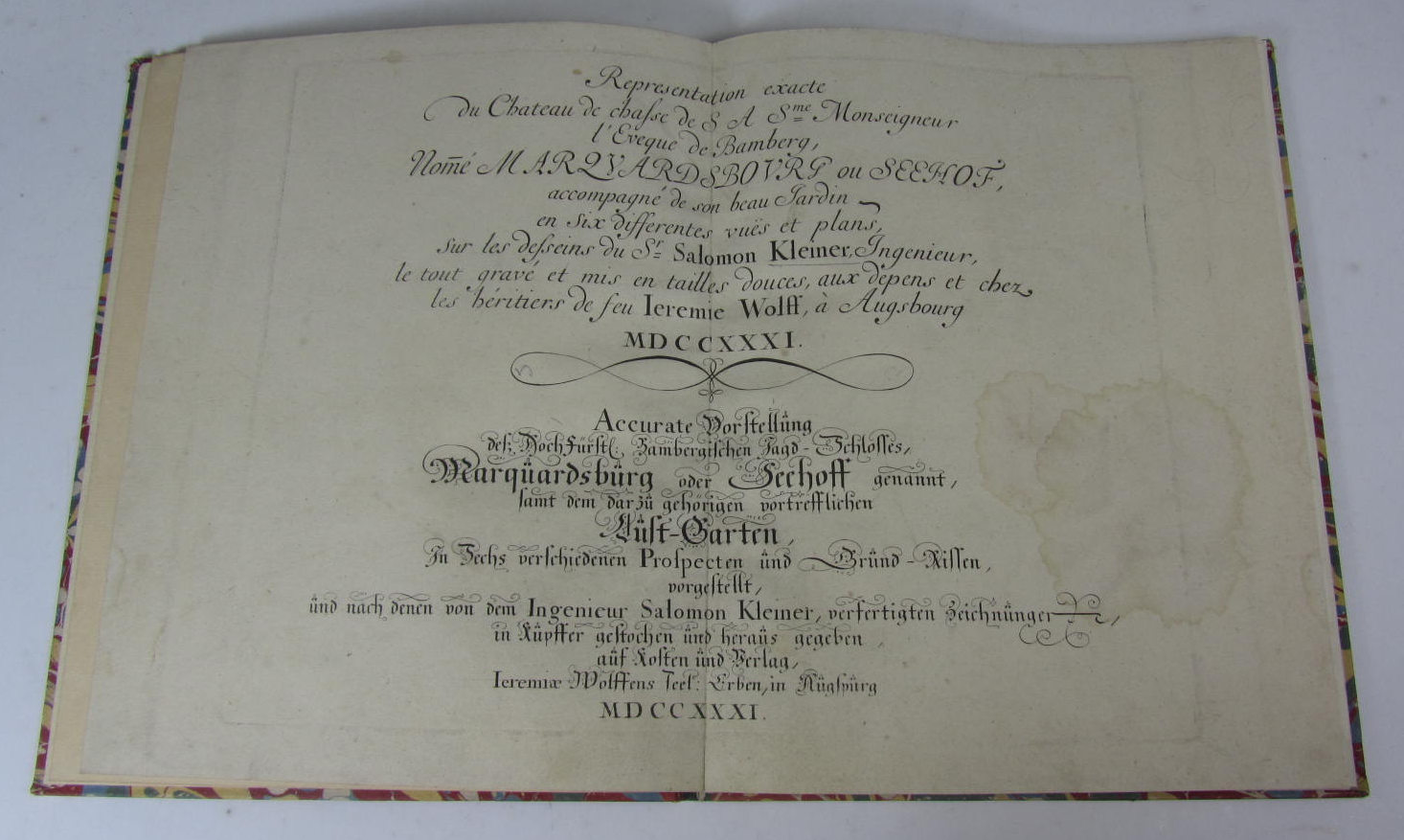 Representation exacte du Chateau de Chasse... Augsburg: Heirs of Jeremiah Wolff, 1731. 4to (300 x 237mm.), double-page engraved title-page in French and German, 6 double-page engraved plates by Kleiner, modern marbled boards, small stain on title-page, some light offsetting [Berlin Catalogue 3341]