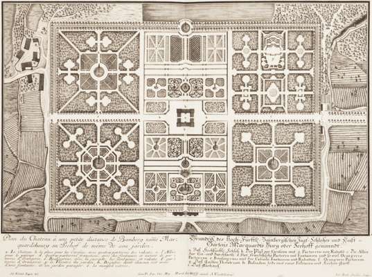 Note: Marquardsburg (just outside Bamberg) was originally created in 1687 as a hunting lodge for the Prince-Bishop of Bamberg. Lothar Franz von Schönborn, who became bishop in 1693, had the lodge and elaborate grounds completed, and several of his residences were engraved by Kleiner.
