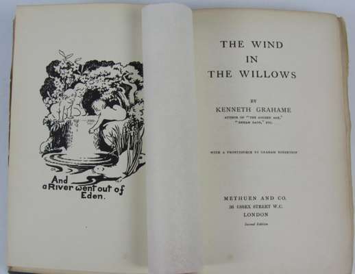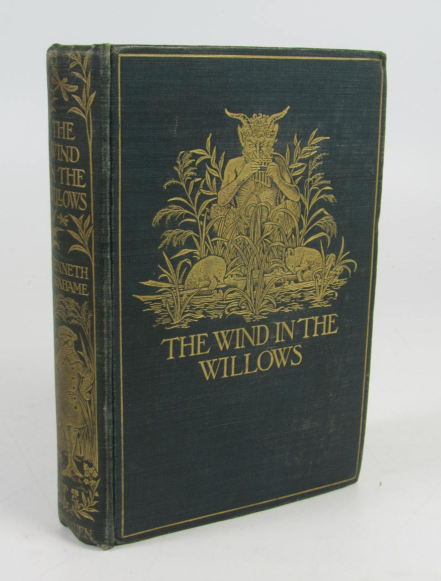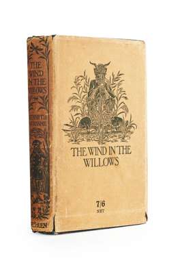 The wind in the willows. London: Methuen and Co., [1908]. Second edition, frontispiece, original green cloth gilt, t.e.g., dust-jacket, occasional very light soiling to a few pages, blank bookplate and ownership signature to endpapers, some rubbing to covers, some chips and soiling to dust-jacket