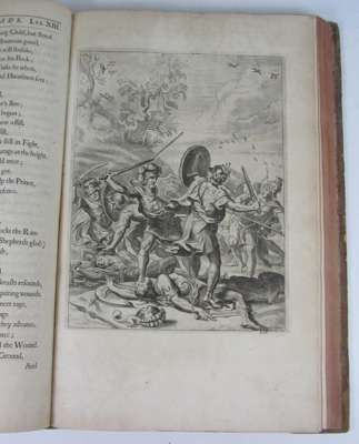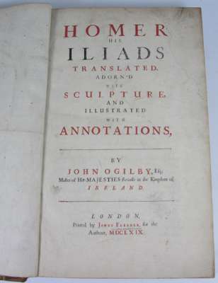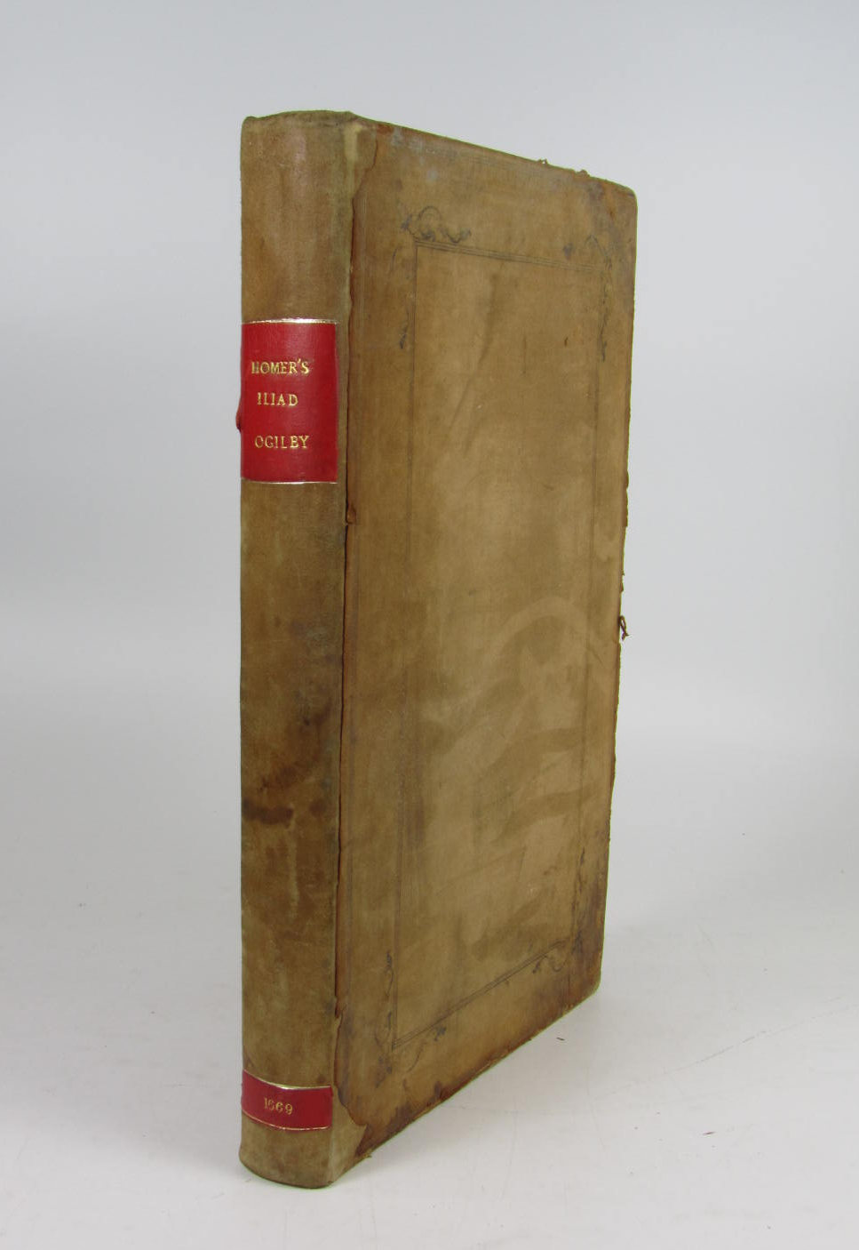 Homer his iliads translated adorn'd with sculpture and illustrated with annotations by John Ogilby... London: printed by James Flesher for the author, 1669. Folio, engraved frontispiece (trimmed with some loss) and portrait by Lombart, and 47 engraved plates, 5 of which are by Wenceslaus Hollar, later suede covers, large closed tear to pp.127-8, and to plate 12, pp.233-4 severely torn with loss to sidenotes [ESTC R30336]