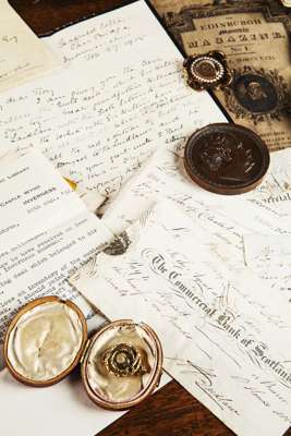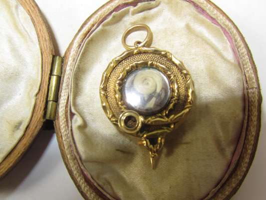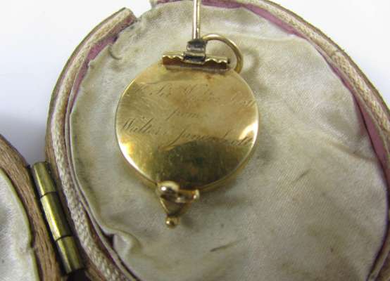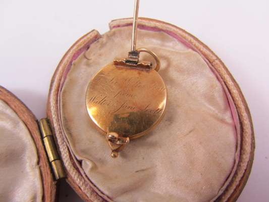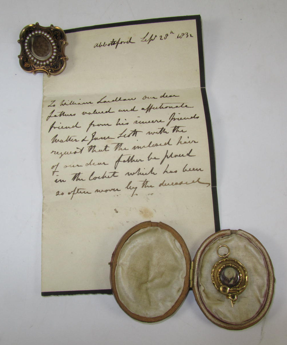 Georgian locket, 2.5 x 2.1cm., containing intertwined hair, given by [Major] Walter and Jane Scott on their wedding day [3 February 1825] to the poet, engraved on verso "To Sir Walter Scott from Walter & Jane Scott", red morocco box, subsequently given after the poet's death to William Laidlaw; with autographed letter from Walter Scott's son "To William Laidlaw our dear fathers valued and affectionate friend from his sincere friends Walter & Jane Scott with the request that the inclosed hair of our dear father be placed in the locket which has been so often worn by the deceased, Abbortsford, Sept. 28, 1832"; together with a Victorian mourning brooch (2)