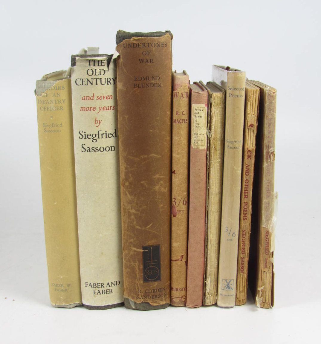 Severn & Somme. London: Sidgwick & Jackson, Ltd., 1917. First edition, 12mo, red cloth with paper label to spine, some fading to cloth, upper hinges cracking a little; [Idem] War's embers, 1919. First edition, 12mo, grey boards, an initial leaf lacking; Sassoon, Siegfried Selected poems, 1925. First edition, 8vo, blue cloth gilt, dust-jacket; [Idem] Counter-attack, and other poems, 1918. First edition, 8vo, original paper wrappers; and another copy; [Idem] Memoirs of an infantry officer, 1930. First edition, 8vo, blue cloth, dust-jacket; Idem] The old century..., 1938. 8vo, First edition, dust-jacket ; Blunden, Edmund Undertones of war, 1928. First edition, 8vo, dust-jacket ; MacFie, Ronald Campbell War, 1918. First edition, 8vo, quarter cloth gilt, dust-jacket (9)