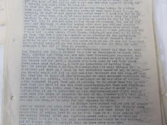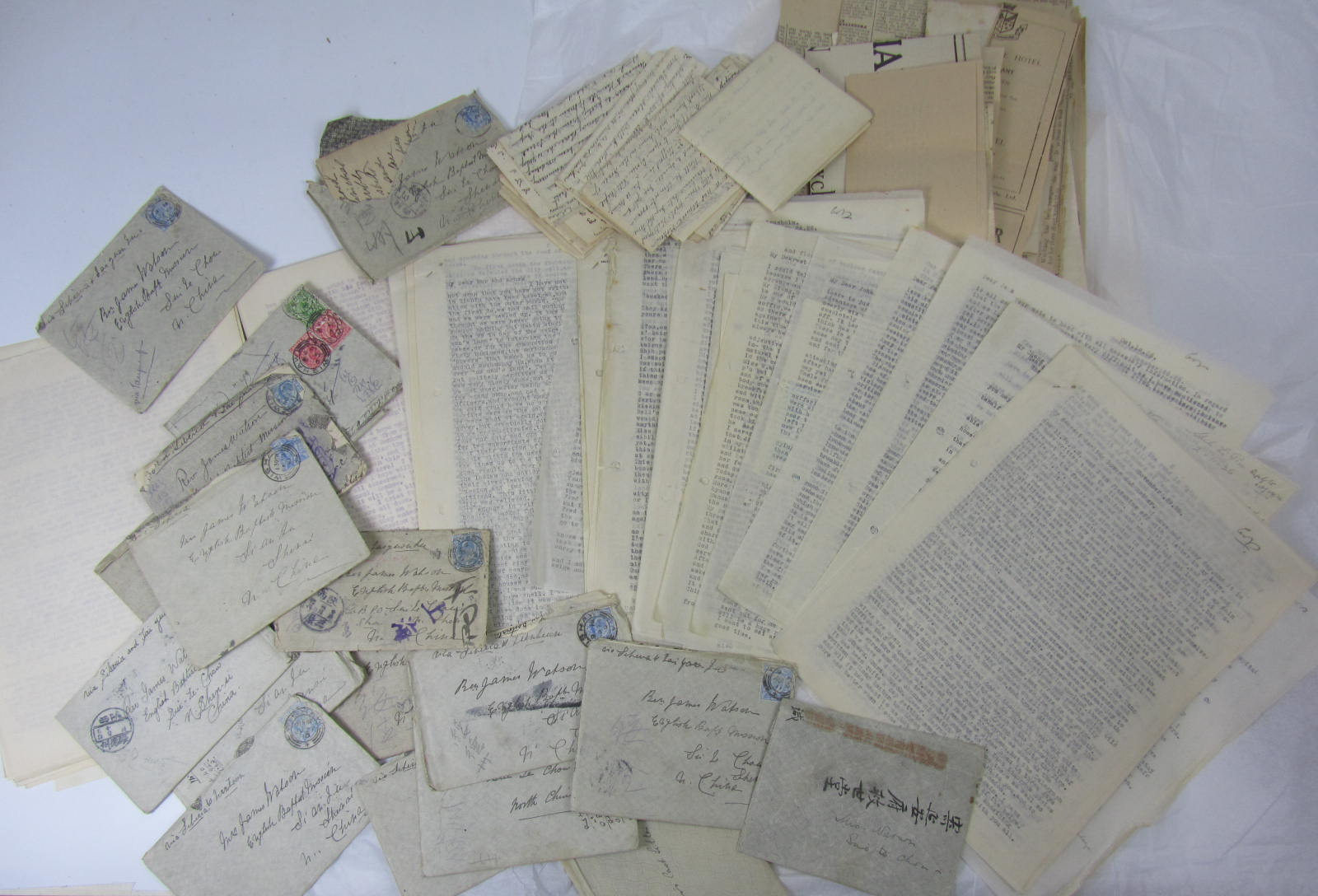 Collection of c.48, letters, some typed, some autograph, from, and c.21, to Rev. James Watson, of English Baptist Mission, Sianfu [Xi'an], Shensi, [Shaanxi, Shenxi], to family and friends, most dated 1926, mostly relating to Sianfu during the siege, other letters to Rev. Watson from the Baptist Missionary Society, newspaper cuttings, typed extracts from the letters of Watson to his wife, &cv. and 2 20th century silk maps of Indo-China, and a bible
