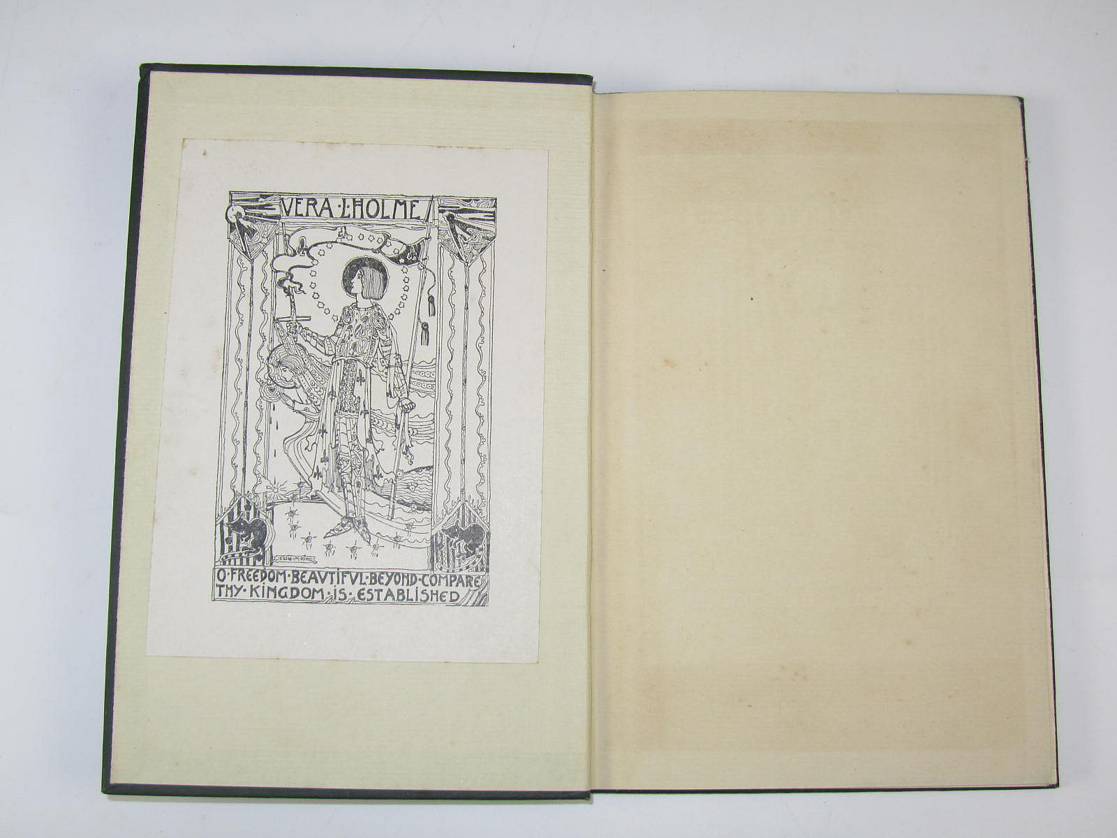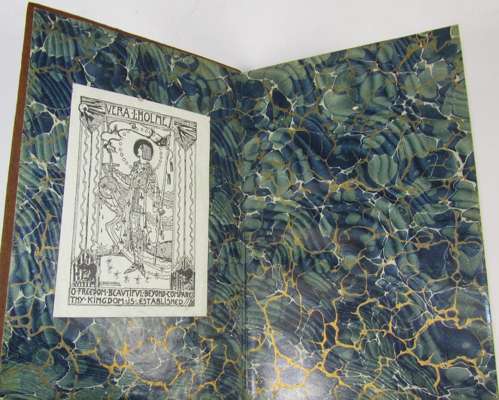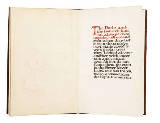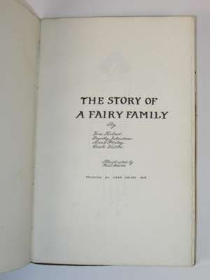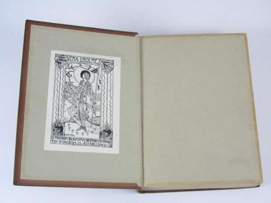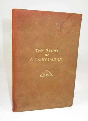 The story of a fairy family, 1918. 8vo, bound manuscript, 29 manuscript pages in red and black calligraphic writing, with 2 illustrations, one by Cecile Walton, contemporary brown suede gilt with initials of Vera Holme, Vera Holme's bookplate designed by Jessie M. King to paste-down endpaper