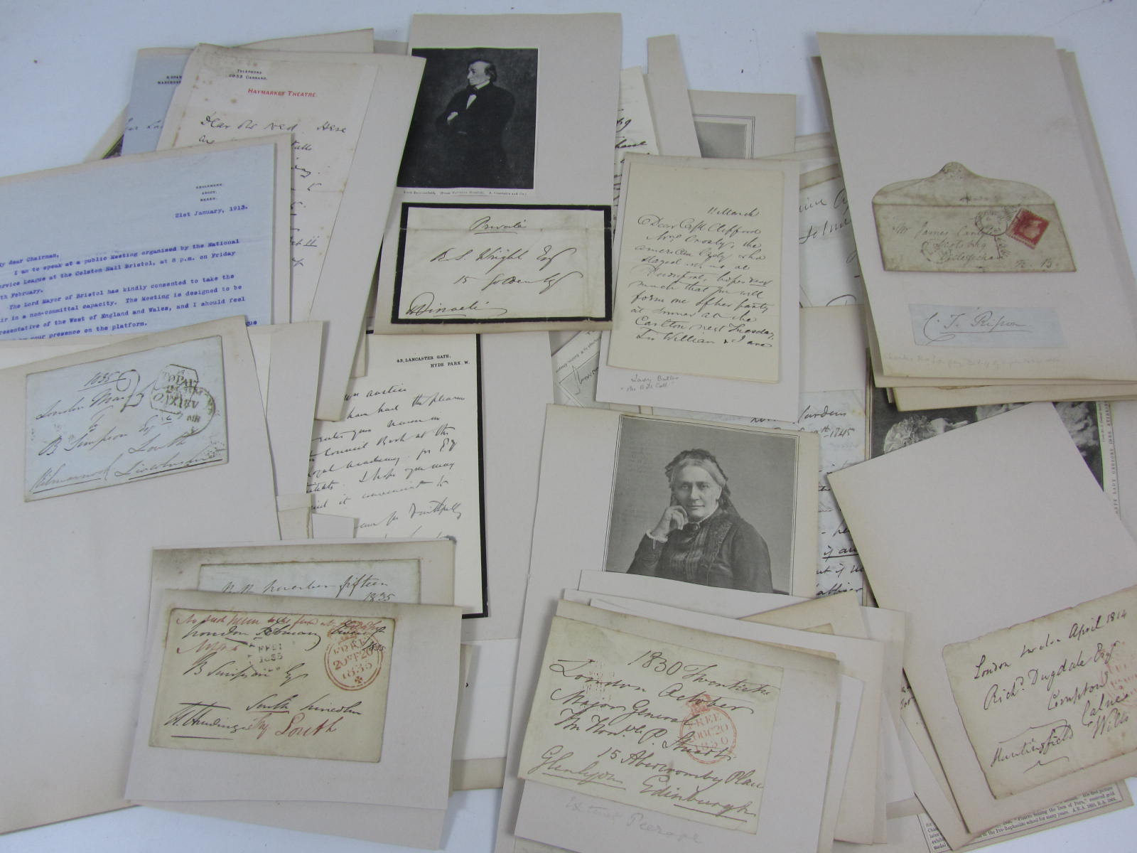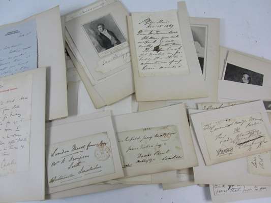 Marquis of Hartington, Jenny [Lind], Thomas Faed, Arthur Morrison, Rhoda Broughton, signature of J.E. Millais on blank paper, autograph envelope fronts signed by Disraeli, Lord John Russell, Earl of Dorset, Earl of Shrewsbury, &c., short A.L.S. from E. Landseer, John Noble, the late Lady Gregory (Mrs Stirling), George Grossmith, Walter Crane (to Mrs Bureman), G. Gilbert Scott to Rev. C.P. Wilbraham, &c., stuck down to card (a small quantity)