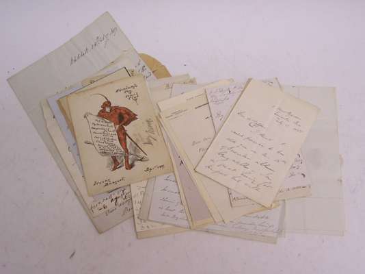 A.L.S. to an unnamed correspondent [probably Alexander Pringle], on parliamentary debate on Ireland: "the tenor of democratic vehemence was unchecked either by the Government or its supporters, no one of whom seemed inclined to rise and express the slightest dissent from the general chorus of Irish sedition... Lord Althorpe made a speech which assumed the tone and equalled the ability of an overseer at a parish meeting... the whole party cursed the signal folly of Lord Ormelie [John Campbell, 2nd Marquess of Breadalbane] in having justified by his silly and impotent provocations all the fury of the Irish agitators", referring to the cashiering of the Irish bishops, O'Connell, Church reform and to Cobbett "Old Cobbett is a regular twaddler, excepting when he is making a personal attack upon the Whigs - in this species of warfare he seems very formidable", 6 pages, Whitehall Gardens, 13 Feb. 1833, very lightly dust-soiled; with 2 franked envelopes signed by Peel addressed to Alexander Pringle, Yair, by Selkirk; and 20 other lesser A.L.S. including ones from Martin Farquhar Tupper, Harold J. Laski, Augustine Birrell, E.V. Lucas, Violet Jacob, Hugh Walpole & Henry Lemon, and a few miscellaneous papers (c.25)
