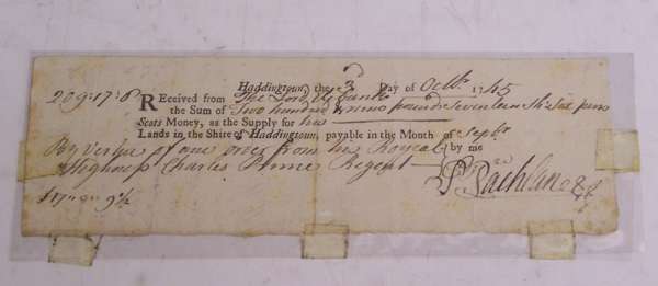 Printed and manuscript receipt for £209:17 0 received from the Lord Elibank as his supply for his Lands in the Shire of Haddingtoun, payable "by virtue of an order from his Royal Highness Charles Prince Regent", signed by Lachlan MacLachlan, with a further note relating to the discharge signed by Lachlan MacLachlan on the verso, 3rd October, 1745