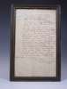 Autograph manuscript signed of preface for A. Gordon Crawford's "Notes on the Millais Collection", 1886, 4to, one page, c. 19 x 31cm., framed and glazed, some light dust-soiling, editor's notes in blue pencil, slip with his signature, Brantwood, 22nd Jan. 1886, pasted onto foot of manuscript text, 25 lines, "the permission given in the hope that some of the fragment might add interest to the most important exhibition of English art yet given in the country but... I must broadly efface any impression that may be given by it of my criticisms having been of any service to the Pre Raphaelite school, except in protecting it against vulgar outcry. The painters rightly resented the idea of misjudging friends that I was either their precursor or their guide; they were entirely original in their thoughts and independent in their practice. Rossetti, I fear, even exaggerated his colour because I told him it was too violent; and to this very day my love of Turner dims Mr Burne Jones's pleasure in my praise."