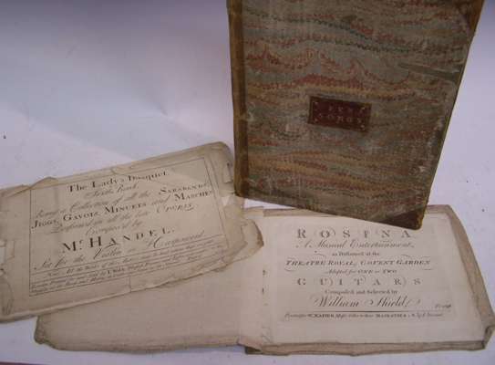 [The most celebrated songs in the Oratorio call'd Athalia. London: Walsh no. 545, c. 1735] pp. 29 , lacking title, [bound with] A second collection of the most favourite songs in the opera called Pastor Fido. London: Walsh mo. 513 [c. 1734], pp. 9, 26 [bound with] Hasse, J.A. The favourite songs in the opera called Artaxerxes. London: Walsh, [c. 1734] pp. 19 [bound with] Hayden, G. Three Cantatas composed, engraved title, pp. 14, London: Walsh no 292, [c. 1735?], folio, contemporary half calf, red label, worn, interior clean; Shield, William Rosina a musical entertainment as performed at the Theatre Royal, Covent Garden adapted for one or two guitars. London: for W. Napier, [no date], oblong 8vo, pp. 29, original paper wrappers, discoloured, and another. [3]