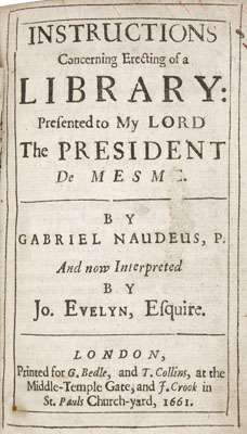 Gabriel Naude, the great French librarian, expressed the essence of bibliophily when he urged that there is no book whatsoever, be it never so bad or decried, but may in time be sought for by some person or other. He found a good student in John Evelyn, who eventully produced a translation of his work after some delay in 1661. However, Evelyn was not happy with the finished product "as fo rthe translation, it has been so insufferably abus'd at the presse that the shame any uncorrected copy should come abroad has made me suppresse as many as I could light on..." This suppression and the original small edition size has made the first 1661 edition of Evelyn's work very rare.