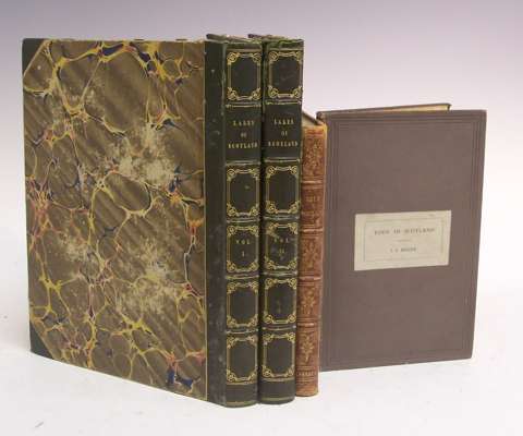 The Lakes of Scotland. Glasgow: J. Swan, 1834, 4to, one volume bound in 2, de luxe issue with 4 engraved titles and 48 engraved plates on india paper, tissue guards, list of subscribers, contemporary green half morocco, spines gilt, sightly rubbed; Jarratt, William Otley. Reminiscences of a tour in Scotland. [Driffield, Privately Printed], 1854, first edition, contemporary red half morocco, some spotting, upper hinge weak, inscribed by John Hornby, a friend who accompanied Jarratt on the tour; Roger, J.C. Reminiscences of a Four Weeks Tour in Scotland. London, Privately Printed, 1895, 8vo presentation copy inscribed by the author, original cloth, upper hinge weak (4)