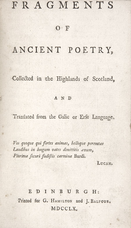 Fragments of Ancient Poetry, collected in the Highlands of Scotland and Translated from the Galic or Erse Language. Edinburgh: G. Hamilton and J. Balfour, 1760, first edition, small 8vo in fours, cut close at head affecting some page numerals only, [bound with] Warton, Thomas, editor. The Union or Select Scots and English Poems. Edinburgh: A. Monro & D. Murray [but Oxford, for Baldwin of London], 1753, first edition, first issue, small 8vo, with reading "Centle" on first page of Contents, title slightly browned at corners, a few minor tears without loss, contemporary half calf, rubbed, joints cracked