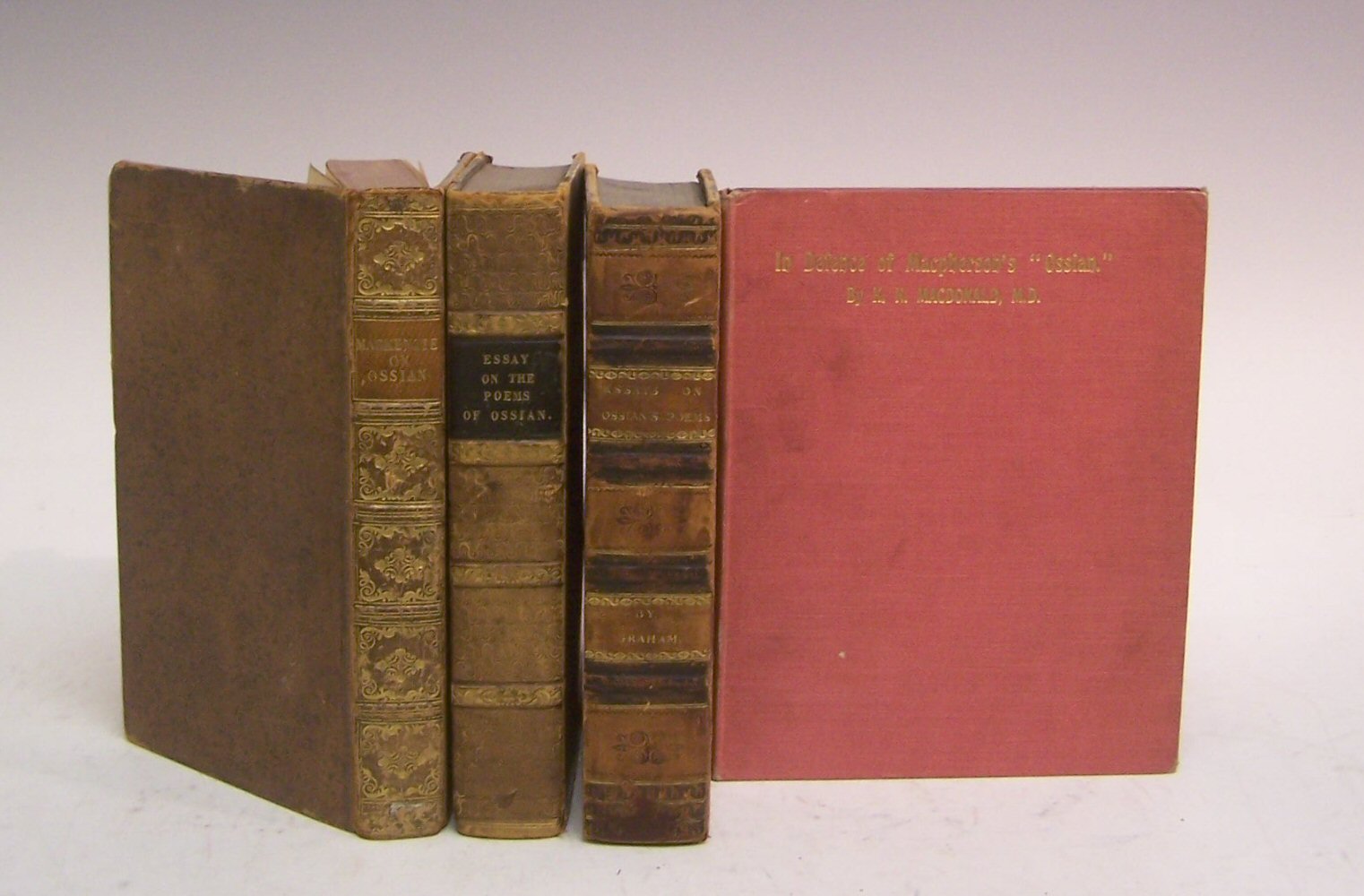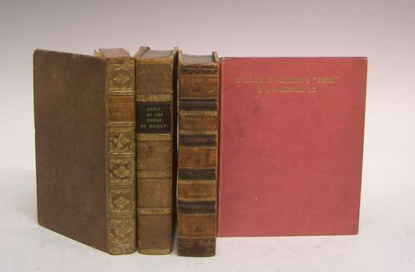 Report of the Committee of the Highland Society of Scotland, appointed to Inquire into the Nature and Authenticity of the Poems of Ossian. Edinburgh: A. Constable, 1805, 8vo, 3 engraved plates, one hand-coloured, contemporary calf, spine gilt; Graham, Patrick Essay on the Authenticity of the Poems of Ossian. Edinburgh: P. Hill [&c.], 1807, 8vo, contemporary half calf, spine gilt, morocco label, small library stamp to title; another copy, 8vo, half-title, list of subscribers, contemporary calf, spine gilt, morocco labels; Macdonald, K.N. In Defence of Ossian. [Reprinted from the Oban Times], 1906, 4to, cloth, small library stamp to title (4)