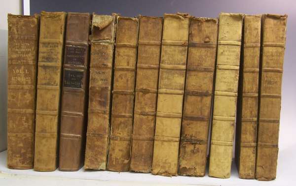 The Acts of the Parliaments of Scotland. [No imprint], 1844-1814-1823, volumes 1-11 (of 12), folio, uniform contemporary half calf except for volume 3 in later half calf, worn, bookplate of Baron Hume 1829 and Edinburgh library stamp in volume 3