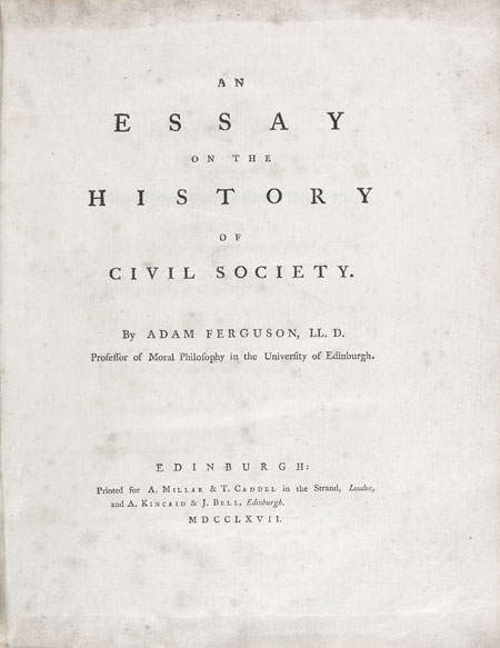 An Essay on the History of Civil Society. Edinburgh: printed for A. Millar & T. Caddel, London and A. Kincaid & J. Bell, Edinburgh, 1767, first edition, 4to, contemporary calf, raised bands, red morocco label, title page very lightly spotted, very small nick to head of spine