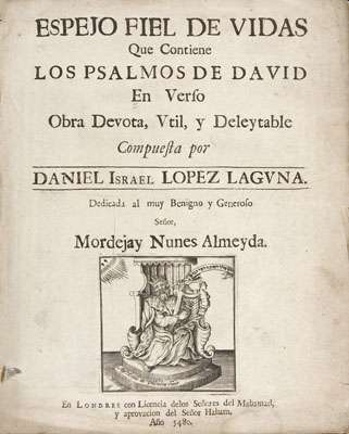 About 1720, Laguna went to London and published the present paraphrase of the Psalms in a variety of Spanish verse forms. The book had originally been planned in prison and represents the fruits of some 23 years of labour. In a number of places, the author makes allusion to the Inquisition and its persecutions. The work is prefaced by various celebratory verses in Spanish, Latin and English. He later returned to Jamaica where he had been naturalised in 1693.