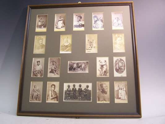 18 cartes-de-visites, by Foy Bros, C. Dickinson, Walker and Dickinson, C.J. Aldham, R.H. Basmans and others of African or New Zealand natives, glued into a single window-mounted mount, most faded, lacking glass; Result of Five Rods, Angling Competition, Canterbury, New Zealand, December 17, 1888, albumen print 24 x 35cm, framed and glazed, very faded and torn with slight loss