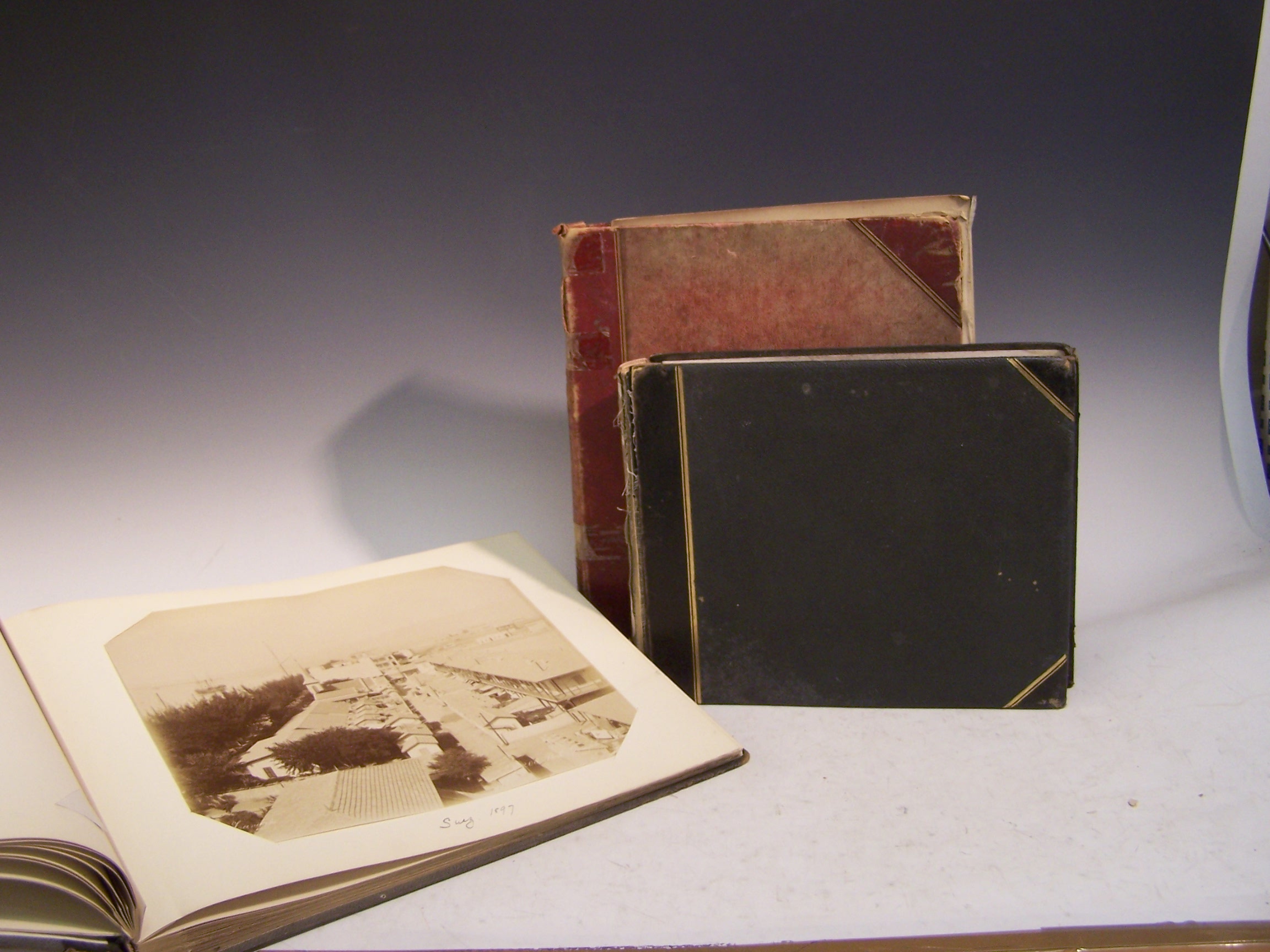 Three photograph albums containing a number of albumen and carbon prints showing Gibralter 1897, Port Said & Suez [titled and captioned "Langaki"], various views of European landscapes, architecture, all three albums worn, some fading to prints (3)