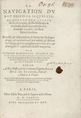La Navigation du Roy d'Ecosse Jaques Cinquesme du nom, autour de son Royaume, & Isles Hebrides & Orchades, soubz la conduicte d'Alexandre Lyndsay excellent pilote escossois. Recueillie & redigee en forme de description hydrographique, & representée en carte marine, & routier ou pilotage, pour la cognoissance particuliere de ce qui est necessaire & considerable à ladicte navigation, par Nicolay D'Arfeville..., Premier Cosmographe du Roy, Commissaire ordinaire de son Artillerie, & a la visitation & description generalle du Royaume de France. Dediee A tres-illustre, & tres-vertueux seigneur, Anne Duc de Joyeuse, Pair & Admiral de France.... Paris: Gilles Beys, 1583.