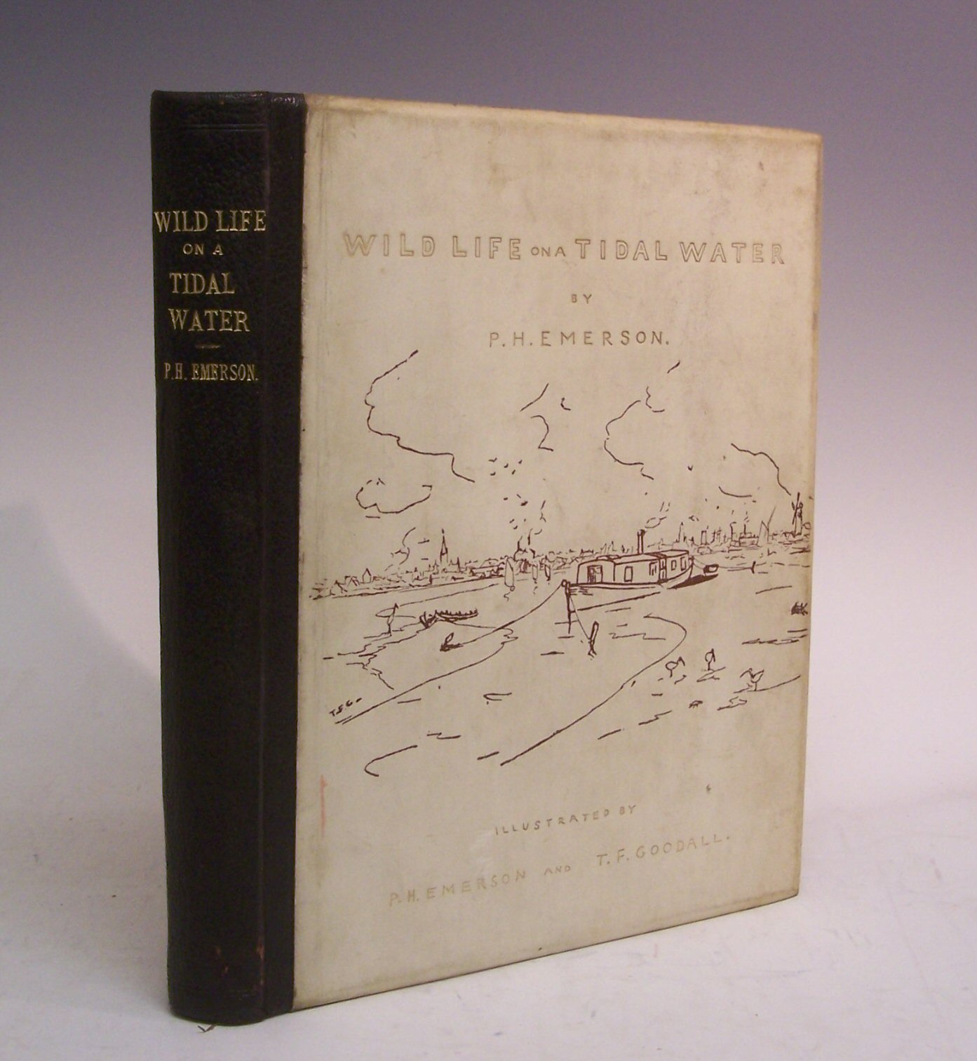 Wild Life on a Tidal Water. London: Sampson Low, 1890, first edition, 4to, number 56 of 100 edition de luxe copies, 30 photo etchings by P.H. Emerson and T.F. Goodall, publisher's black morocco-backed parchment, plate 1 lacking captioned tissue guard, some spotting and light discolouration to title and frontispiece, a few leaves with light thumb marks, covers somewhat dust-soiled