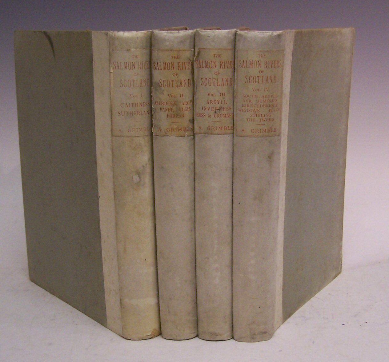 The Salmon Rivers of Scotland. London: Kegan Paul, 1899-1900, 4to, 4 volumes, 4 maps, 64 plates, publisher's insert, volume IV uncut, original quarter vellum, paper labels, worn in patches, labels rubbed and chipped, corners bumped, boards of volume IV foxed, interiors very clean (4)