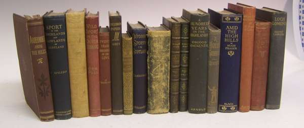 Ardenmohr among the Hills, a record of Scenery and Sports in the Highlands of Scotland. London: Chapman and Hall, 1876, 8vo, illustrated, original decorative cloth gilt, some rubbing to edges, some foxing, front endpaper blind stamped; Pell, C.V.A. Wild Sport in the Outer Hebrides. London, 1901, illustrated, original red cloth gilt, backstrip faded, interior clean; Speedy, T. Sport in the Highlands and Lowlands of Scotland with Rod and Fun. Edinburgh, 1884, 8vo, illustrated, original green cloth gilt, interior clean, owner's ink inscription to front endpaper; Hall, Henry Byng Highland Sports and Highland Quarters. London, [no date], 8vo, 2 volumes, illustrated, contemporary half blue morocco gilt, backstrips faded, some foxing; Mackenzie, Osgood A hundred Years in the Highlands. London, 1921, 8vo, 6 plates, original cloth gilt, heavily stained boards, interior clean; Peel, E. Lennox A Highland Gathering. London, 1885, 8vo, illustrated, original decorative grey cloth gilt, foxing; and 11 others (17)
