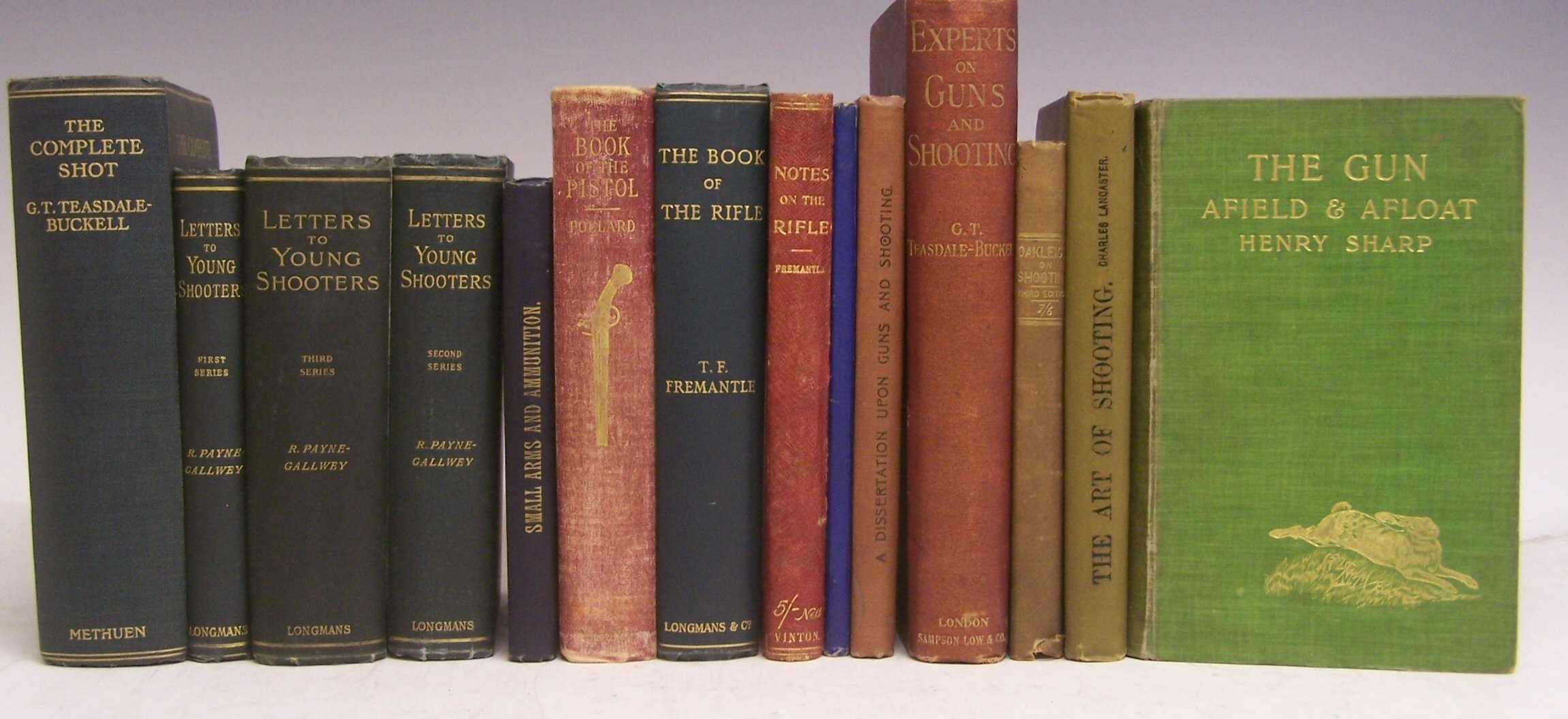Experts on Guns and Shooting, 1900; The Complete Shot, 1907; Oakleigh, Tom. The Oakleigh Shooting Code, 1838, third edition, engraved title and plates; Lancaster, C. An Illustrated Treatise on the Art of Shooting, 1889, plates, a few loose; Marks, E.C.R. The Evolution of Modern Small Arms and Ammunition, [c.1898]; Pollard, H.B.C. The Book of the Pistol & Revolver, New York, 1917, half-title loose, binding edges rubbed; Freemantle, T.F. The Book of the Rifle, 1901; Notes on the Rifle, 1896, plates, original red morocco-backed cloth, g.e., lightly rubbed; Sharp , H. The Gun afield & afloat, 1904, spine slightly spotted; Higson, D. Seafowl Shooting Sketches, 1909; Harrison, E. A Dissertation upon Guns and Shooting, 1906; Payne-Gallwey, R. Letters to Young Shooters, 1914-1892-1896, 3 volumes, slight spotting, all 8vo, publisher's cloth; and 16 others (30)