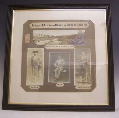 Arenes d'Arles-sur-Rhone. Corrida du 6 juillet 1913 and du 3 mai 1914, eight albumen prints mounted on card with captions in two frames, framed and glazed, 42 x 42cm; [Tiger hunting] Four albumen prints (8 x 10cm.) of a tiger hunt with framed bullet, framed and glazed, [c.1900]; [Bechuanaland] Albumen print of "Bechuanaland chiefs who visited this Museum in October 1895", with signatures below, framed and glazed, 1895, 15 x 19cm.; [Early aviation] Framed photograph by M. Dotta [?] of an early airplane surrounded by observers, mounted, framed and glazed, 30 x 40cm; and a framed photograph of a crocodile (6)