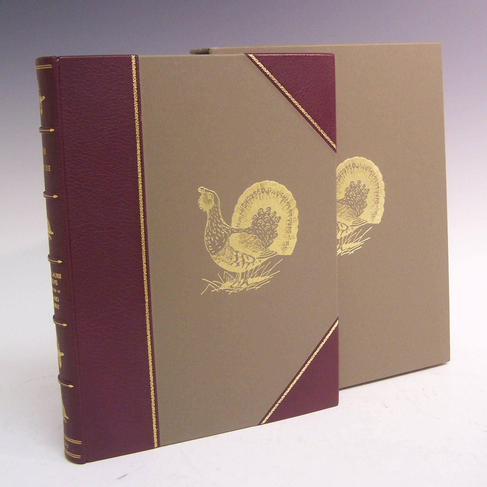 The Grouse, Studies in Words and Pictures. Norfolk: Fine Sporting Interests Ltd, 1991, 4to, number 297 of 300 copies, signed by both author and artist, original sepia drawing by illustrator beneath signatures, 24 tipped in colour plates, original half burgundy morocco gilt, slipcase, a mint copy in original packaging with all original ephemera enclosed