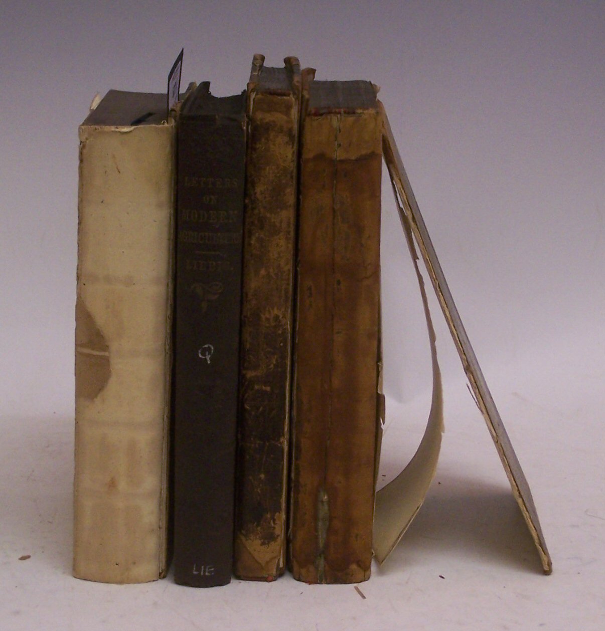 Narrative of the Arctic Land Expedition to the Mouth of the Great Fish River. London: J. Murray, 1836, first edition, 8vo, 17 plates, folding map, contemporary half calf, lacking spine and lower board, internally clean; Liebig, J von. Letters on Modern Agriculture, 1859, 8vo, publisher's cloth; [Trial.] The Trial of Charles Angus... for the Wilful Murder..., 1808 [bound with] A Vindication of the Opinions delivered in Evidence, 1808 [bound with] Remarks on a late publication entitled "A Vindication of the Opinions" by J. Carson, 1808, 8vo, contemporary calf, worn, covers detached; Watkins, J. The Important Results of an Elaborate Investigation into the Mysterious Case of Elizabeth Fenning, 1815, 8vo, half calf, some soiling, worn, covers detached (4)