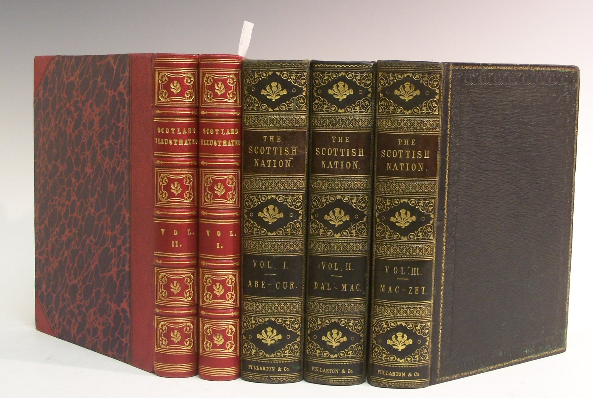 Caledonia illustrated in a Series of Views... London: George Virtue, [no date], 4to, 2 volumes, engraved titles, map, 168 plates, later half morocco gilt, some foxing to titles; Anderson, William The Scottish Nation. Edinburgh, 1865, 4to, 3 volumes, 30 plates, contemporary morocco gilt, red and black labels, a.e.g., some foxing and offsetting (5)