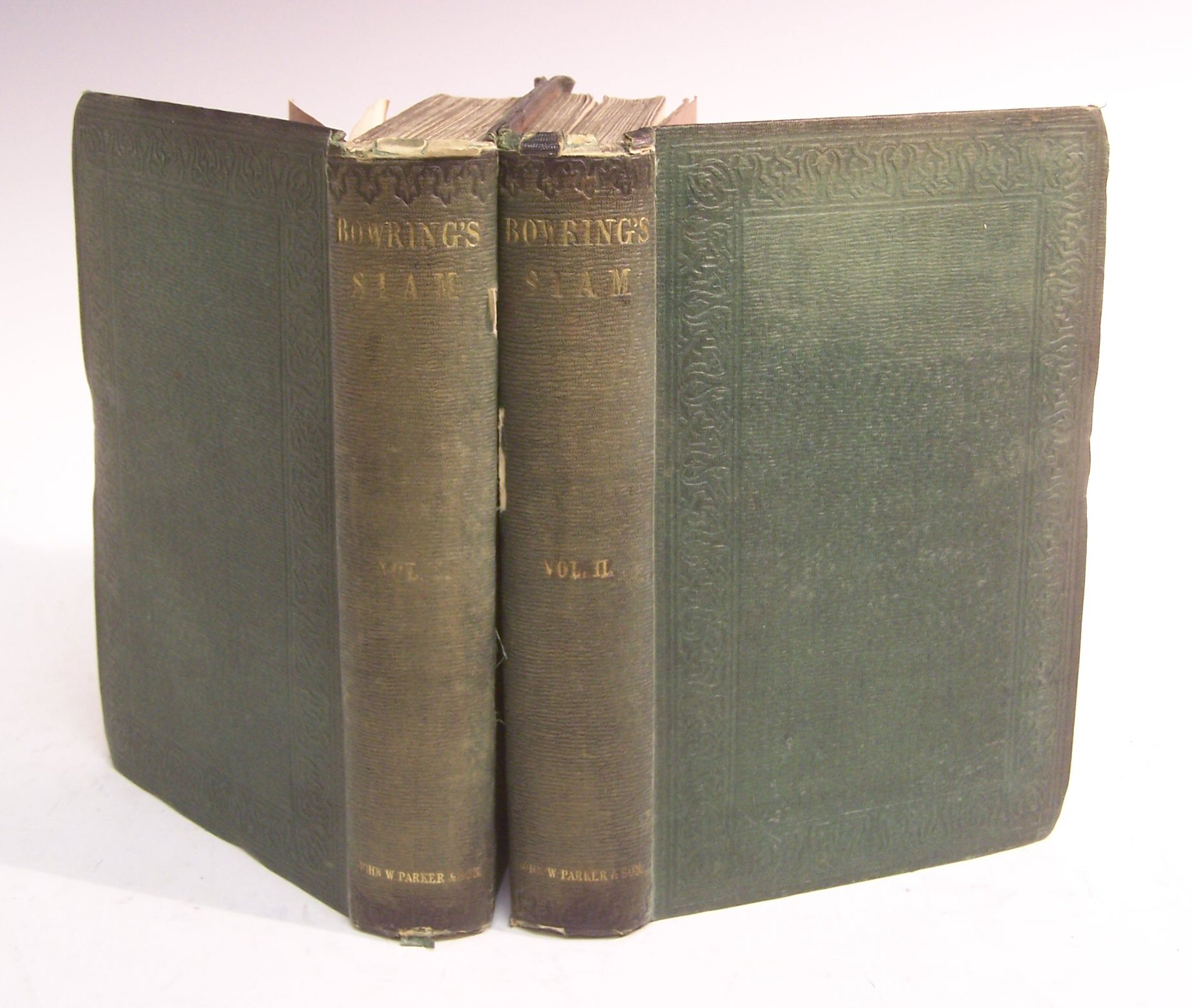 The Kingdom and People of Siam. London: John W. Parker, 1857. First edition, 8vo, 2 volumes, 16 plates, 2 folding facsimile letters, folding map & leaf of ads at end of each volume, original green cloth gilt, rubbed, small tears to backstrips, library labels removed from upper boards, bookplates (2)