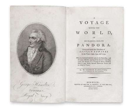 A Voyage round the World in His Majesty's Frigate Pandora. Performed under the Direction of Captain Edwards in the Years 1790, 1791 and 1792. Berwick: Printed by and for W. Phorson, B. Law and Son, London, 1793, first edition, 8vo, engraved frontispiece portrait, contemporary quarter calf with marbled sides and vellum tipped corners