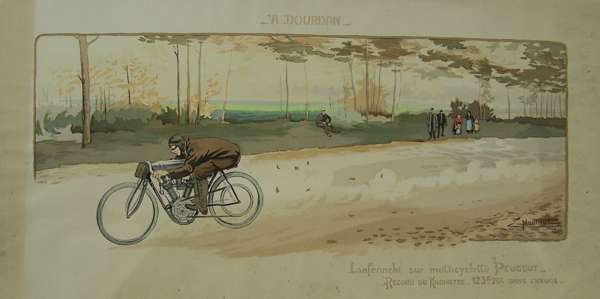 A collection of four motoring lithographs, coloured, including Chauffeuse, c.67 x 56cm high, worm damage along upper edge, tear at lower edge; L'epave, 1904, c.90 x 45cm high, torn at left edge [some loss], water staining along lower edge; A Dourdan, 1904, c.90 x 45cm high, faded at left edge, some foxing, tears to lower edge; Untitled, 1905, c.53 x 70cm high, faded, worm damage across upper section [including within image], some staining; Montaut, Ernest A' Toute-allure. Paris, 1903, poster, c.50 x 65cm, pasted onto board, stained and faded; and a selection of 13 other motoring prints by artists such as Geher, Pierre Gatieu, Guyp, all in poor condition [worming, tears and staining] (18)