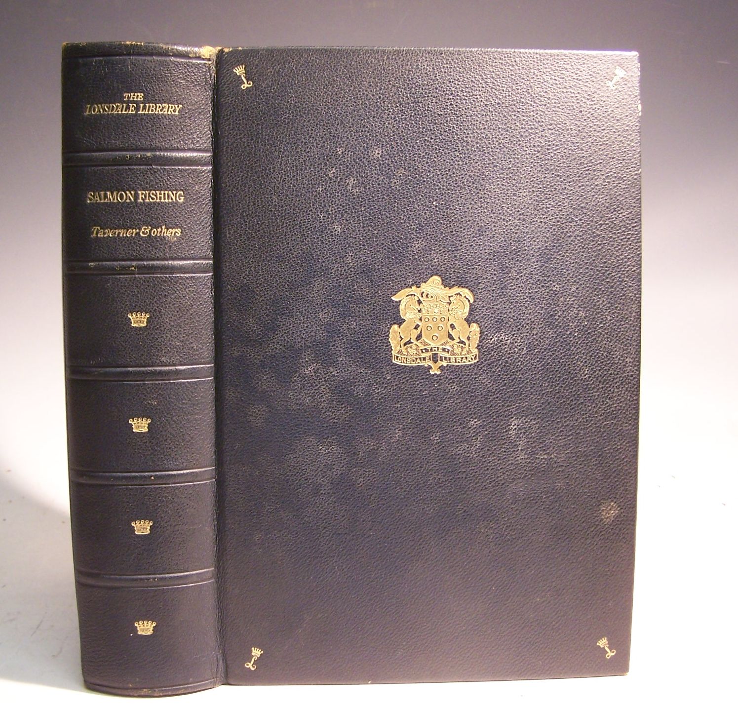 Salmon fishing. London: Seeley Service, 1931. Lonsdale library, 8vo, number 72 of 275 large paper copies signed by the author, plates, 7 actual artificial flies mounted behind plastic inside rear cover, inscription on front endpaper, original blue morocco gilt, t.e.g., others uncut, covers slightly mottled