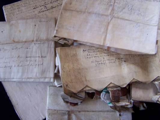 Grant from Jown Fowler of Fitlyng & Beatrice his wife to Matilda, daughter of Richard Wade, of land & a tenement in Fitling (Yorks.), 12 March 1392, 10 x 32cm., one (of 2) seals; Grant of Thos. Foston of Gembling to Robt. Bylett of Kylnesevn & Holderness of land in Partington (Yorks), 2 March 1539, 23 x 45cm., wax weal; Indenture between Frances Countesse Dowager of Rutland and John Earle of Rutland relating to coppice, woods & trees, 1652, wax seal, 34 x 54cm.; Indenture on paper relating to Aldbrough (Yorks.), 23 March 1750, Letter of attorney from Brian Stapilton of Wighill to John Alkeyness & others to receive services from Sir C. Bulmer, 1 May 1508, 13 x 33cm, lacking seal; Conveyance by Richard Holmes & Christopher Crofter of Catholes to Rowland Blanch of Sedberg, of the tenement at Earlby (Yorks), 2 July 1620, 28 x 49cm, lacking seal; Indenture, on paper of land sold by Tho. Colthurst of Weddington to Ric. Colthurst of Bashall of closes in Weddington (Yorks), 1632, 40 x 30cm.; Indenture between Mary Crosley of Thornhill to Elizabeth Crosley her sister of land in Dewsbury (Yorks), 15 December 1662, 29 x 64cm.; Deed between Margaret Tempest & John Taylor of Hackney relating to a house called Bifrons, 2 July 1695, on vellum, lacking seals, holed with loss; Indenture betweeen Robt. Newnham of Hornby & John Newnham of a house and land in Brompton, 3 May 1704, 44 x 61cm.; Indenture between Tho. Heber of West Marten and Robert Wilson of land known as Bellfaltts in E. Marton, 1681, 22 x 41cm., most on vellum, Latin and English, folded, a few slightly soiled; and 11 others, similar (24)