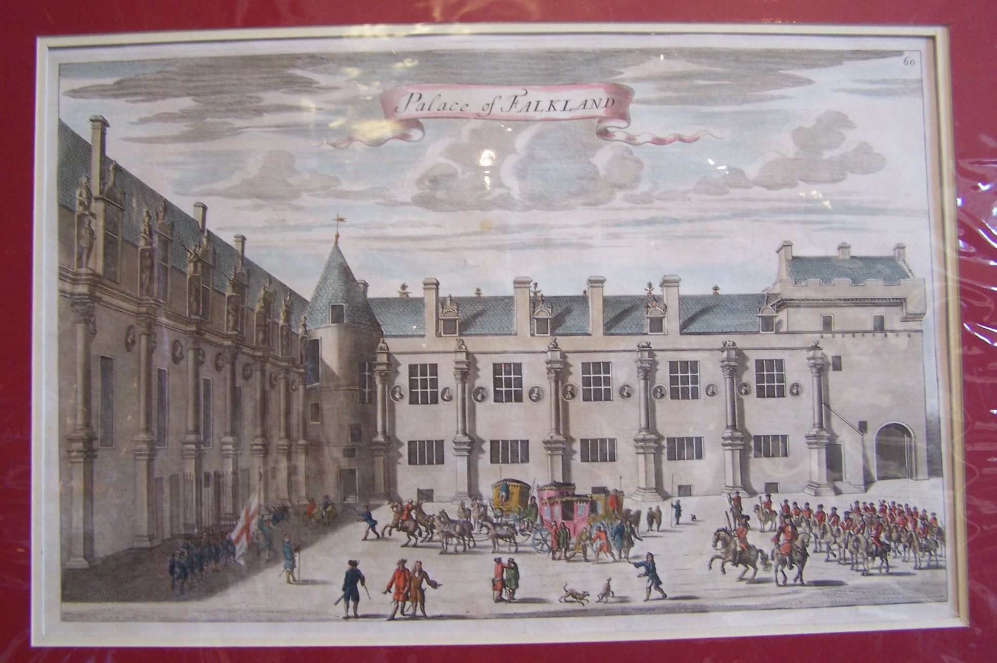 Falkland palace; Culrosse palace and garden; Dunblane cathedral; Melrose abbey; Kelso abbey, 5 engravings by John Slezer, all hand-coloured and handsomely mounted (5)