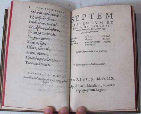 [Anonymous] Dicta septem sapientum, & eorum qui cum iis numerantur. Paris: Guilaume Morel, 1558 [1559]. 8vo, 20th century brown morocco gilt, g.e., text in Greek and Latin, four pages with Latin translation in minute early script [USTC 198327]