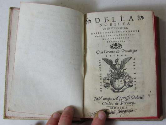Della nobilta et eccellenza... Venice: Gabriel Giolito de Ferrarii, 1544. 8vo, woodcut device on title and a6, first blank lacking, headlines cropped; [bound with] Aletiphilo, Leilo (Translator) Historia di Avrelio et Isabella... Venice: Gabriel Gioli di Ferrarii, 1563. 8vo, woodcut device on title and verso of E8, headlines croped; [bound with] Sansovino, Francesco Talti Ragionamento. Mantua: Mag. Mad. Gasparina, 1545. 8vo; later vellum, bookplate to paste-down endpaper, some notes in ink to free-endpaper