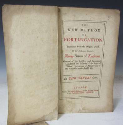 The new method of fortification. London: Daniel Midwinter, 1705. Folio, title in red and black, 16 engraved plates (13 folding), contemporary calf, bookplate of Lord Gretton, upper cover detached, lower part of spine lacking, rubbed, some spotting and darkening [ESTC T101519]