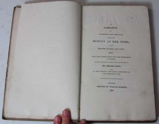 A narrative of occurrences that took place during the mutiny at the Nore... Chatham: printed by William Burrill, 1829. 8vo, original? boards, bookplate of Lord Gretton, joints split, a little foxing, newspaper clipping laid down onto page 24 relating to Her Majesty's ship Scout's Proportions, does not obscure text, a few words scored out with ink