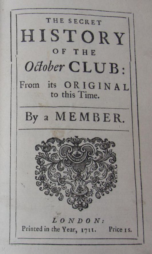 The secret history of the October Club: from its original to this time. By a member. London: Printed in the Year 1711. First edition, 2 parts in one volume, half-title, calf gilt by Riviere, Henry Carlisle Tuttle copy with bookplate, [ESTC T066270; ECCO CB3327024575]; [Idem] The Scots nation and union vindicated, from the reflections cast on them, in an infamous libel. London: A. Bell for J. Baker, 1714. First edition, 4to., 28pp., modern wrappers, [ECCO CW3300186351]; [Idem] An essay at removing national prejudices, against a union with England. Part III. [London]: printed in the year 1706. 4to, 35pp., one leaf misbound; A fifth essay, at removing national prejudices. [London]: Printed in the year MDCVII [but 1707]. 4to, [8], 35pp., 2 works in one volume, blue morocco- backed cloth, Earl of Perth's crest on upper board; [ECCO CW3304801378 & CW3304682743] (3)