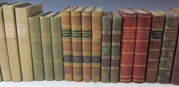 Memoirs of the history of France during the reign of Napoleon... London: Henry Colburn and Co., 1823-1824. Second edition, 8vo, 4 volumes (of 7?), 5 plates (of 11?), 8 engraved maps, several pages uncut, contemporary grey boards with labels to spines, bookplates, spines a little faded, some bumping to corners, a couple of closed tears to pages with no loss of text, additional copies of pages 155-156 and 207-208 bound in between pages 390 and 391 of volume 2; The fall of Napoleon... London: G.W. Nickison, 1845. 8vo, 3 volumes, original green cloth, bookplates, spines a little faded, a couple of closed and marginal tears with no loss of text; Bourrienne, M. de Memoirs of Napoleon Bonaparte. London: Richard Bentley, 1836. 8vo, 4 volumes, 4 portraits, 22 (of 28?) plates, 1 folding map, contemporary half calf, bookplates, rubbed, some spotting, a few pages loose, some pages with closed tears, no loss of text; Ségur, Comte de Histoire de Napoléon et de la grande-armée... Paris: Badouin Frères, 1825. Second edition, 8vo, 2 volumes, 1 folding map, contemporary half calf, rubbed, some spotting; Simeon, Stephen Louis The private life of Napoleon. London: Richard Bentley and Son, 1894. 8vo, 2 volumes, portraits, contemporary red half calf, bookplates, rubbed, a little damp-staining; And 4 others (19)