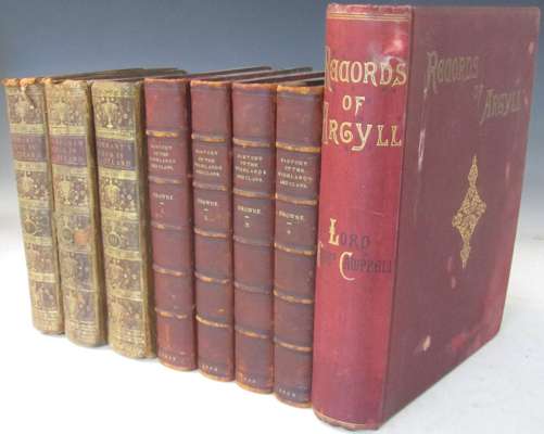 Pennant, Thomas A tour in Scotland. London: Benjamin White, 1776. Fourth edition, 3 volumes, engraved plates, contemporary tree calf gilt, rubbing and bumping to covers and spines, some internal spotting and soiling, previous owner's bookplates to endpapers and Gaelic inscription in volume 1, a few leaves lacking; Campbell, Lord Archibald Records of Argyll... Edinburgh: William Blackwood & Sons, 1885. Limited edition (number 342), 4to, frontispiece, 16 etched plates, original red cloth gilt, tissue guards, binding dampstained, soiled and a little faded, interior fairly clean with occasional spotting and some slight darkening, ex libris; Keltie, John S. History of the Scottish Highlands, Highland clans and Highland regiments. London: William Mackenzie, n.d. [1890]. Small 4to, 5 volumes, 66 plates (including maps and portraits), original red cloth gilt, g.e., spines faded, some slight foxing; Napier, Mark Memoirs of the Marquis of Montrose. Edinburgh: Thomas G. Stevenson, 1856. 8vo, 2 volumes, 10 portraits, contemporary half calf, binding slightly rubbed and soiled, occasional slight foxing and offsetting; Stewart, David Sketches of the character, manners and present state of the Highlanders of Scotland. Edinburgh: Archibald Constable & Co., 1825. Third edition, 8vo, 2 volumes, hand-coloured folding map, contemporary blue panelled calf with gilt tooled border and spine, some rubbing and soiling to binding. occasional foxing, map torn, ex libris; Browne, James A history of the Highlands... London: A. Fullarton and Co., 1849. 8vo, 4 volumes, 4 engraved frontispieces, folding map (with a couple of small tears), 61 plates (22 coloured), red half morocco, binding rubbed and soiled, occasional foxing; And 15 others, all books carrying 'ex libris' bookplates; Sold not subject to return (32)