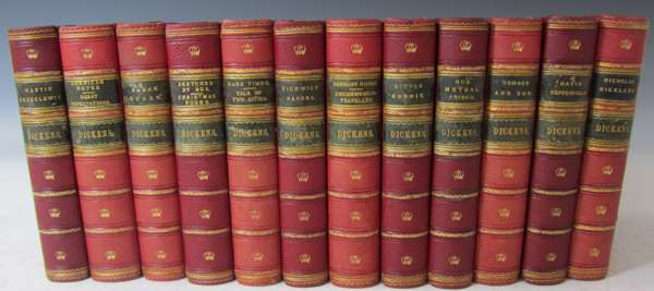 Works. London: Chapman and Hall, [n.d.] 12 vols., 8vo, red half calf gilt, with plates, some plates lacking, 'Nicholas Nickleby' lacking pp.1-2 and 'A Tale of Two Cities' with printing error on p.49, some fading to spines; Scott, Sir Walter Waverley Novels. Edinburgh, 1857. 8vo, 25 volumes, contemporary tree calf gilt, marble endpapers, some wear to spines and joints of a few volumes slightly cracked, very minor foxing; [Idem] Waverley Novels, 1871. 8vo, 25 volumes;[Idem] Scott's Poetical Works, 1872. 8vo, 2 volumes;[Idem] Tales of a Grandfather, 1872. 8vo, 2 volumes; Uniform contemporary blue half calf gilt, slight fading to spines and very slight soiling to some covers; Thackery, William Makepeace The Works. London: Smith, Elder & Co., 1869. 24 vols., 8vo, contemporary half calf gilt, marble endpapers,t.e.g., some cracking to joints, wear to a few spines, minor spotting; Lytton, Lord Edward Bulwer Works. London: George Routledge and Sons, 1873-1875. 34 volumes, 8vo, contemporary maroon half calf gilt, some very minor bumping to spines, two instances of minor offsetting between flyleaves and title pages and pp.149-156 of 'Last of the Barons' loose but present, interiors clean (Quantity)