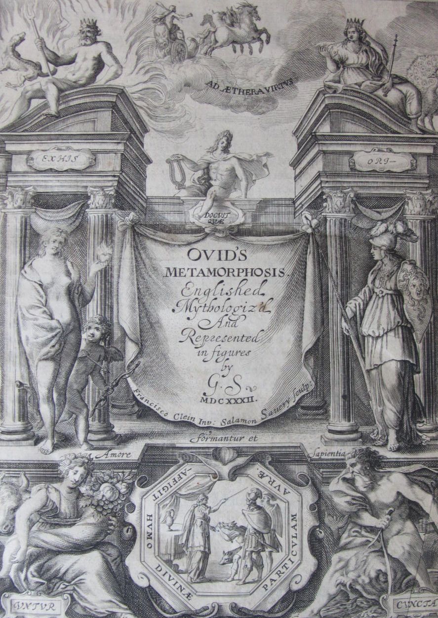 Metamorphosis, Englished, mythologized and represented in figures... Oxford: imprinted by John Lichfield, 1632. Large 4to, engraved portrait and title and 12 engraved plates (of 15), 20th century half calf, slight fading to spine and upper cover, portrait, title, pages up to p.51 and errata leaf repaired with loss to a few letters, occasional spotting and marginal darkening, very small amount of marginal worming with no loss of text [STC 18966]
